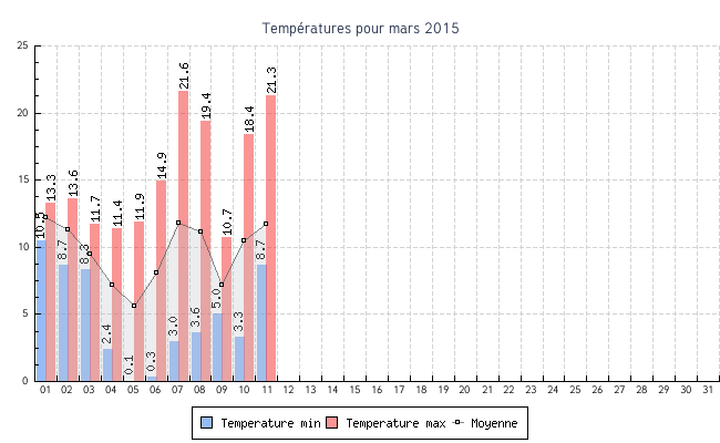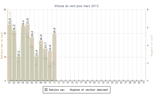 | 11 | 8.7 °C | 21.3 °C | 11.7 °C | 2.3 km/h (19.8 km/h) | NO |